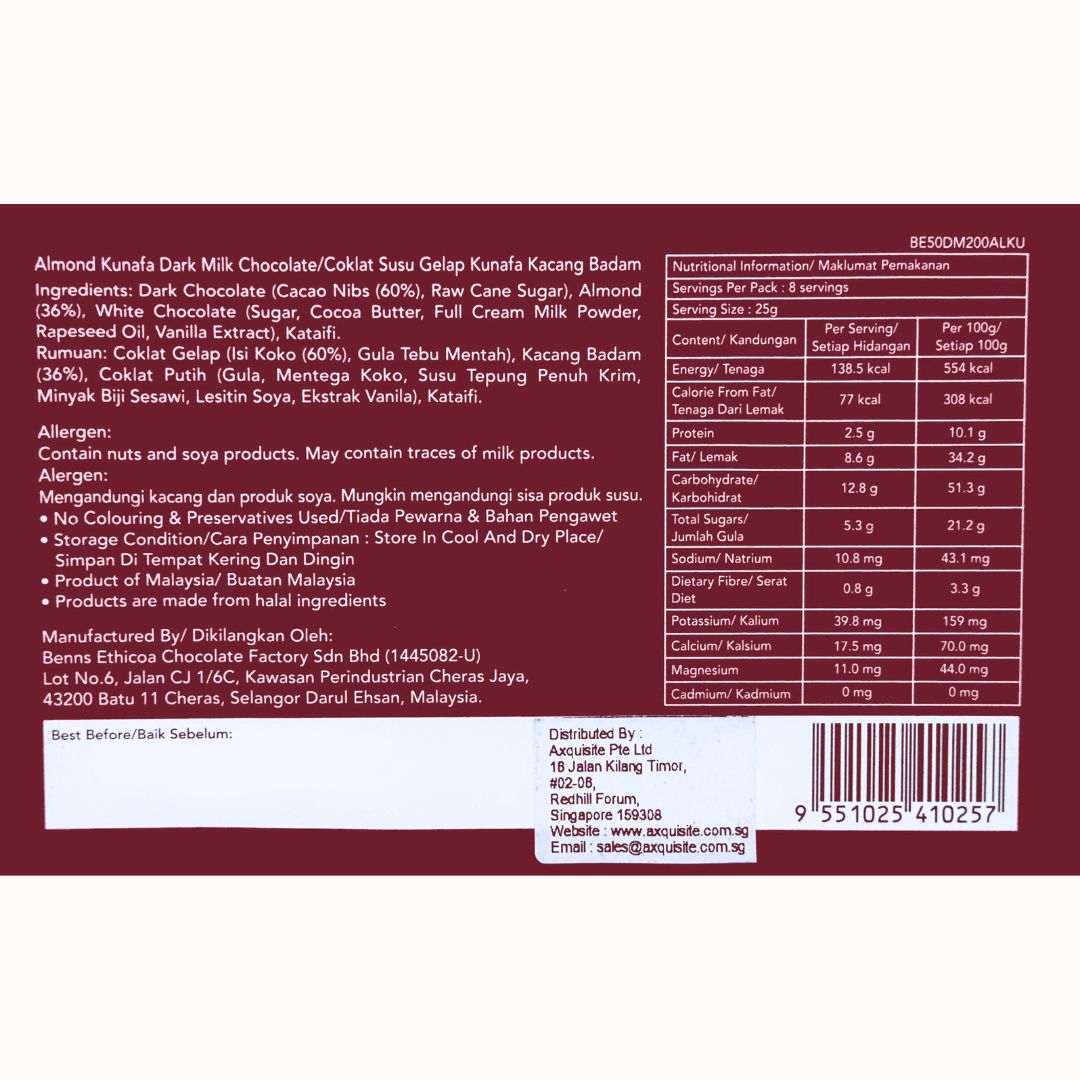 - Product Ingredient: Dark Milk Chocolate (Raw Cane Sugar, Cacao Nibs(20%), Full Cream Milk Powder, Cocoa Butter), Almond (36%), White Chocolate (Sugar, Cocoa Butter, Full Cream Milk Powder, Milk Fat, Soya Lecithin, Vanilla Extract), Kataifi.
